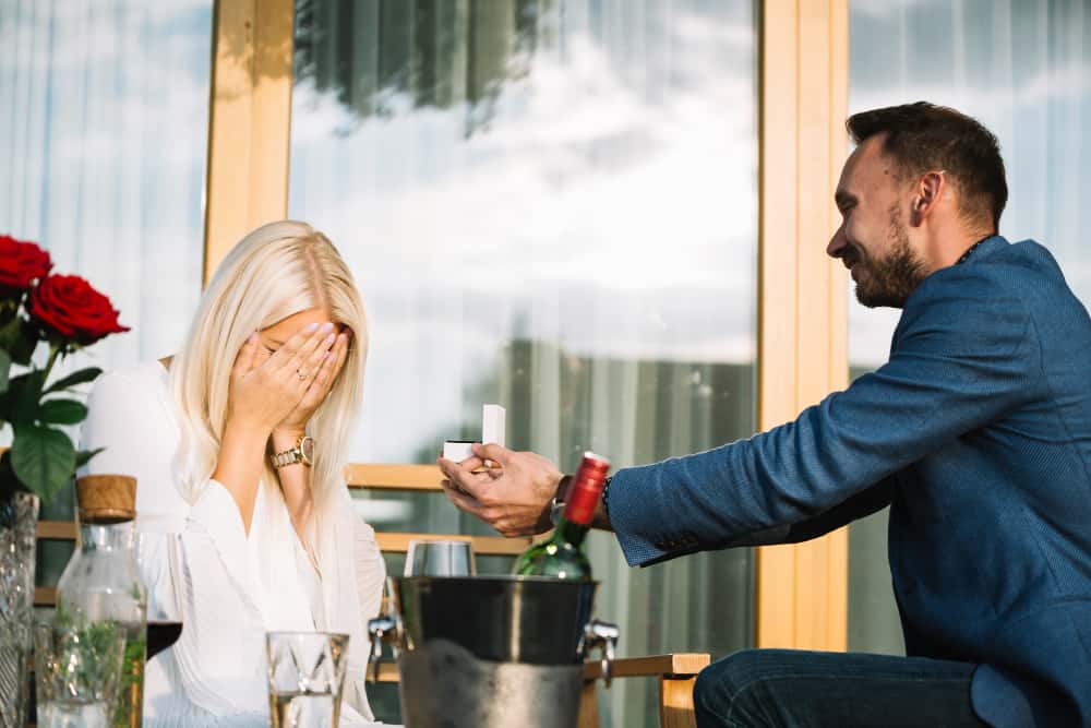 Un homme souriant en veste bleue agenouillé présentant une bague à une femme émue lors d'un dîner romantique pour faire sa demande aux piliers de votre mariage.